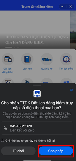 Bước 5: Nhấn vào App và chọn “cho phép” để số điện thoại của bạn được đăng ký/ đăng nhập nhanh chóng tại TTDK Đặt lịch đăng kiểm.
